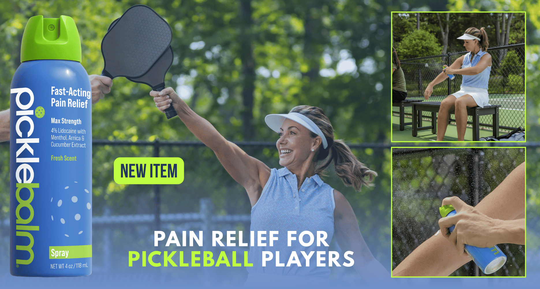 Unfortunately, aches and pains can get in the way of our fun. But it doesn’t have to anymore because Picklebalm just added a new Pain Relief Spray that features the same powerful pain-relieving formula that made it the best topical pain reliever for pickleball players on the planet. Picklebalm’s new spray is great for hard-to-reach areas and it provides a light, even coverage without manual spreading. Grab a bottle today so you can play more and hurt less.