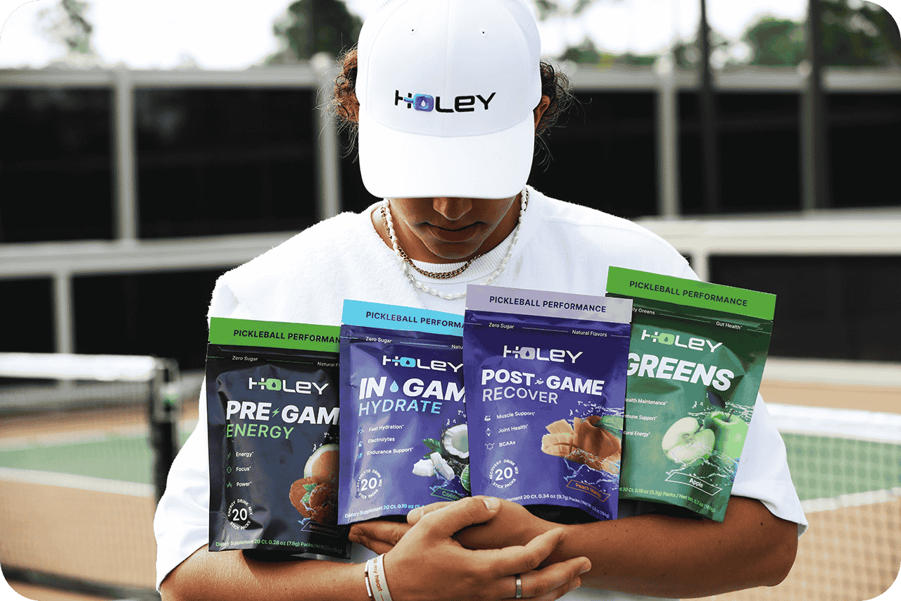 Holey is built as a full pickleball performance stack: a pre-workout with caffeine, L-theanine, and nootropics to get you sharp; in-game hydration packs with sodium, potassium, and magnesium to keep your muscles and nervous system firing smoothly; and post-game recovery packs with creatine, amino acids, and joint-support ingredients to help you bounce back.